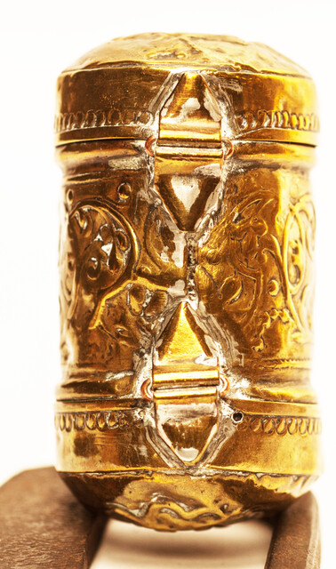 A tinderbox complete with steel and flint. High 8 cm. Diameter 4,5 cm. The box divided by a steel sheet into two compartments, one for tinder and the other for a firestone. The outside  nicely decorated with mythological birds, flowers and fruit. With a double set of hinges secured with silver solder. In good general condition with obvious signs of frequent use. Inside a sheet of paper with on both sides a description in Dutch. Holland, eighteenth century.