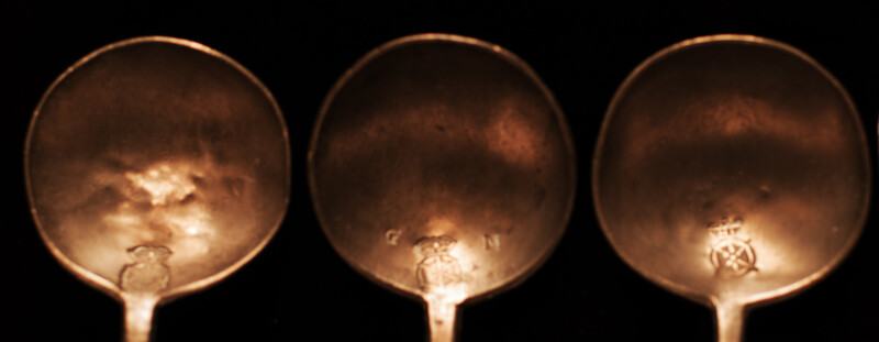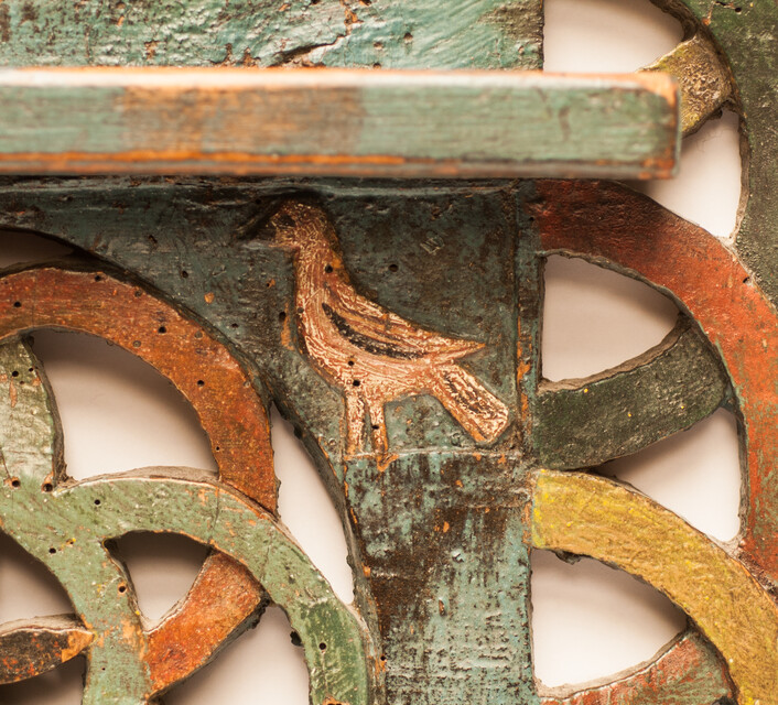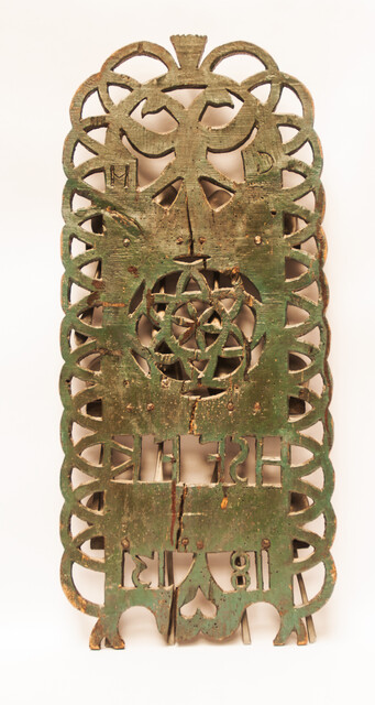 A spoonrack. High 72 cm. Wide 32 cm. Dated "1813". With owners initials. Extensively decorated with birds, a magic knot and a double eagle. In good general condition with some signs of aging. With 12 pewter spoons, most of them with hallmarks. Most likely the rack was made and used in the province of Friesland.