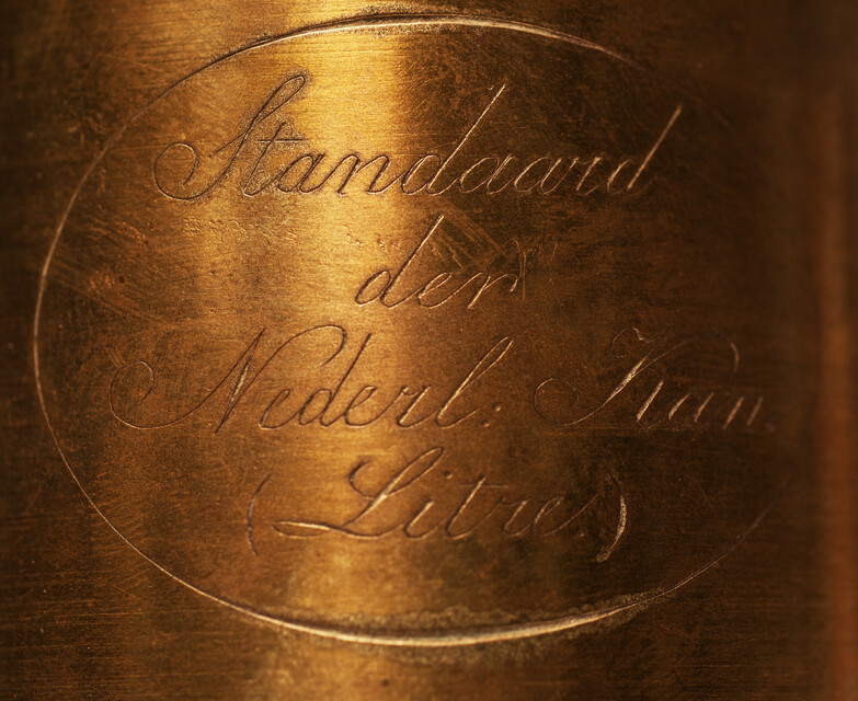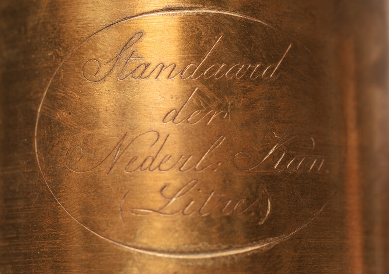 A heavy brass measuring can in a wooden box. Size of the box : 21,5 cm x 13,5 cm x 12,5 cm. Size of the can : 18 cm. Weight 2260 gram. On the can the engraved text: " Standaard der Nederl: Kan .(Litre)" From an official Hallmarking Office. The metric system was adopted from the French in 1820. The can is fitted in a wooden case with some labels and signs from the Hallmarking Office. Can and case in mint condition.