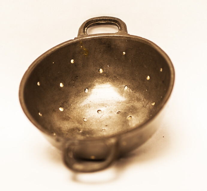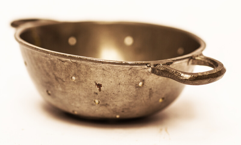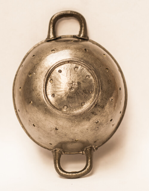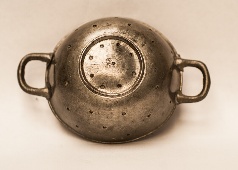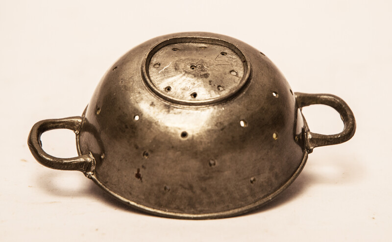 A pewter toy strainer with 18th century Dutch hallmarks.
