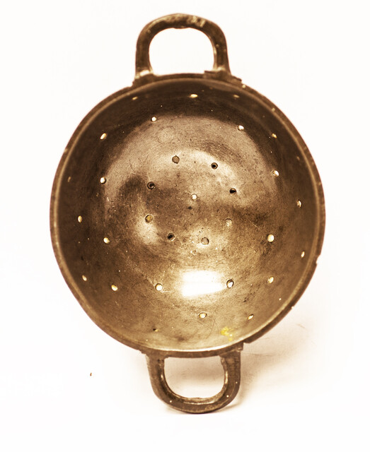 A toy strainer. Diameter (without handles) 8 cm. Diameter with handles 11,5 cm. Height 3 cm. With a small stand ring. Well patinized pewter with on the outside bottom two early 18th century Dutch hallmarks. In mint condition. No damages, no repairs. !8th century undamaged pewter toys are very rare.