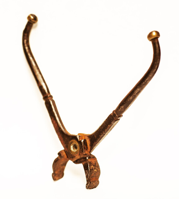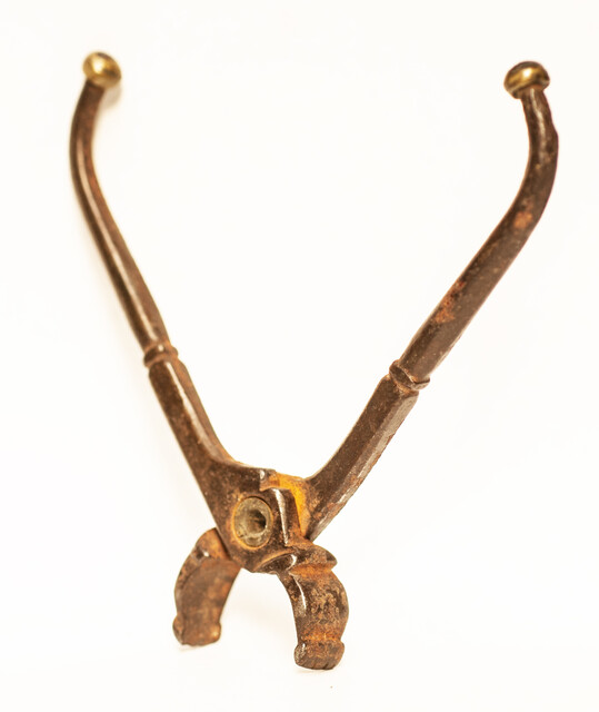 A dental forceps. Length 11 cm. Lightly serrated beak. Both handles decorated with a brass stud. An exactly identical forceps is shown on page 51 in Elisabeth Bennions book "Antique Dental Instruments". The forceps on that page belongs to the Museum of the History of Science in Oxford and is dated around 1700. The forceps is in pristine condition with signs of use. It is extremely rare.