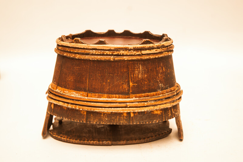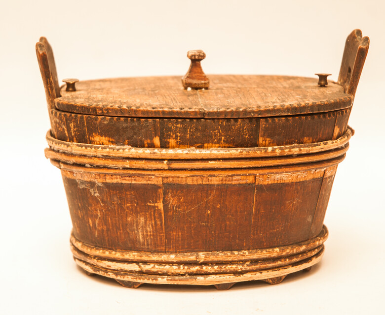 A buttercup. High 12 cm. Wide 12 cm. Made from cooped oak with willow bands. Painted in a red colour. Separate lid with two brass and one wooden peg. Inside also painted in a red colour. Nice patina. On several small feet in a darker kind of wood. In good condition with signs of use. Friesland around 1750.