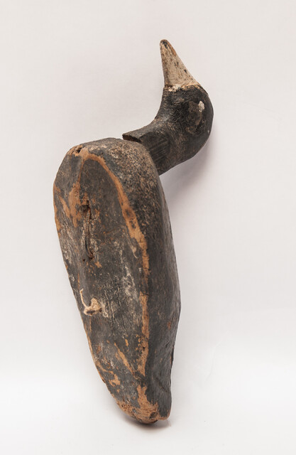 A decoy. Long 28 cm. High 12 cm. Wide 14 cm. On the underside two iron bars for the application of lead weights. The decoy was apparently meant not for catching ducks but for coots. A decoy coot is very unusual. The bird is in a good general condition with signs of extensive use. Dutch, nineteenth century.