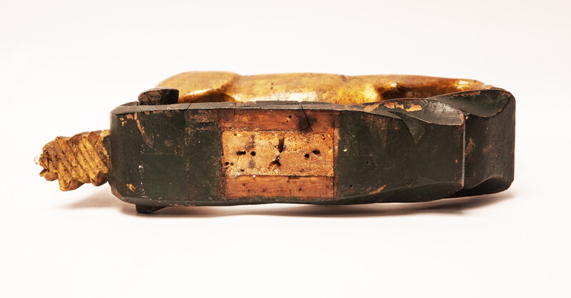 A rudder horse. Overall length 24 cm. Height 20 cm. Nicely carved in wood and subsequently gilt. In very good general condition with obvious signs of use. Considering the size it most likely was the decoration of the rudder of a small Frisian ship. Friesland around 1750.
