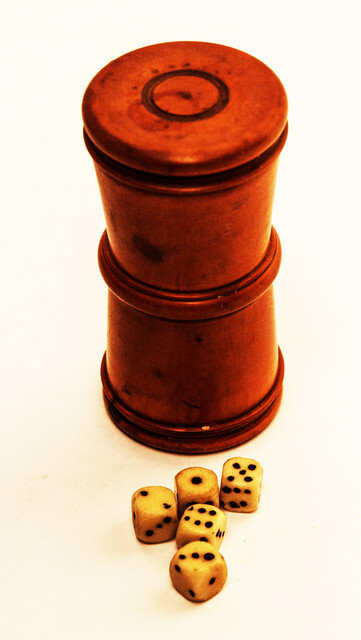 A dice box with 5 dices. High 8 cm. Diameter 3,5 cm. Well figured boxwood. Mint condition. Low Countries early nineteenth century.