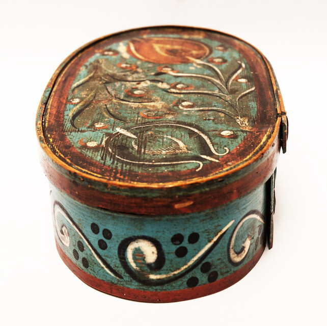 A painted wooden box. Long 30 cm. Wide 17 cm. High 8 cm. This oval box from Southern Germany is painted with typical "Wismuth Malerei". Featuring a red and a blue tulip. The box is in mint condition. No damages, repairs or restorations. Especially the very attractive  vivid colour is very well preserved.