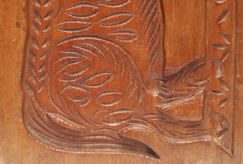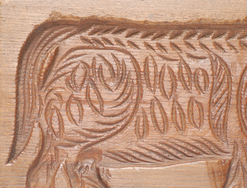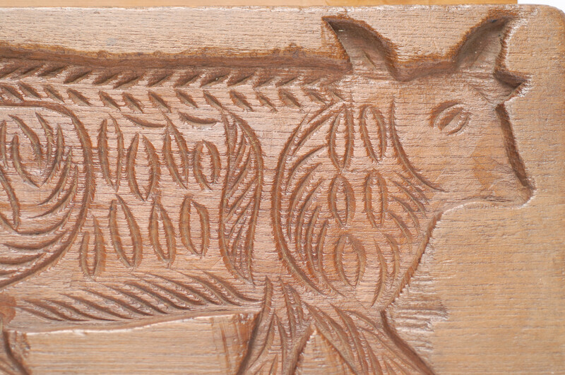 An oak cookie mould. Size 31,5 x 21 cm. Thickness 25 mm. On one side a man on a horse. On the other a cow. Nicely cut and in good condition with some signs of use and age. Holland around 1750.