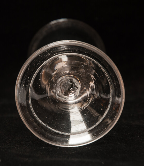 A glass. High 15 cm. Upper diameter 6,5 cm. Diameter foot 7 cm. Weight 140 gram. Sodaglass with several irregularities. Hollow foot with a folded rim and an early unpolished pontil. Mint condition Holland, around 1725.