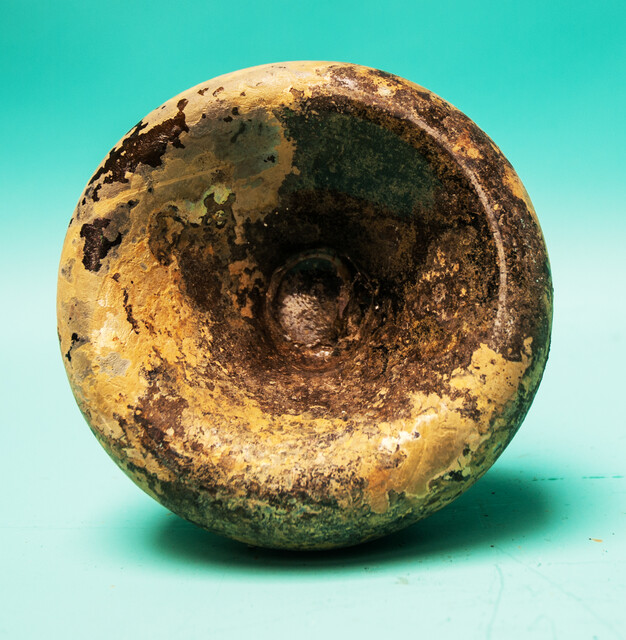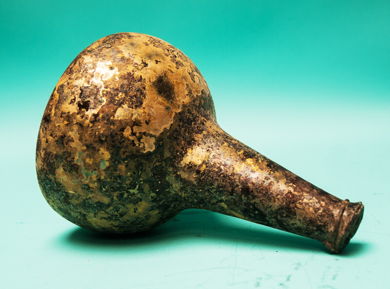 A bottle. High 21 cm. Maximal diameter 15 cm. Weight 735 gram. Found in a wreck of a Dutch ship travelling to a Dutch colony in the East Indies. With stunning gold patina caused by the influence of the tropical sea. In mint condition.