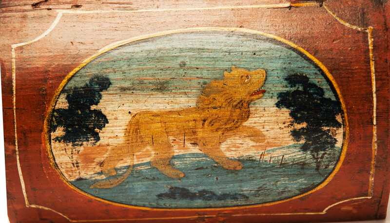 An eightteenth century German painted box with "Wismuth Malerei" featuring a lion in a landscape.