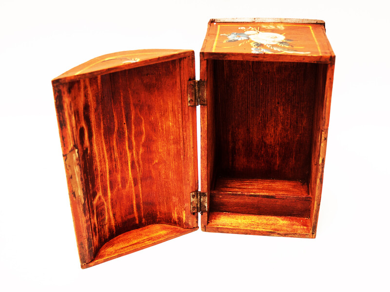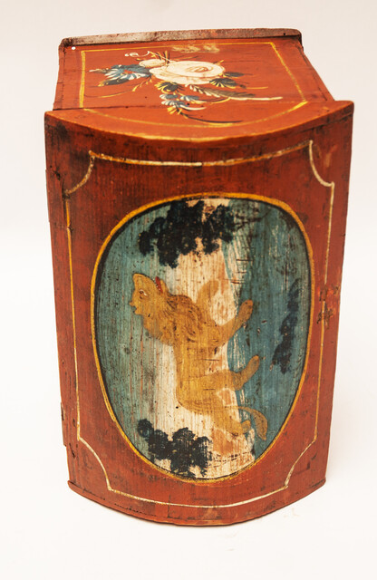 A painted wooden box. Long 25 cm. Wide 16,5 cm. High 16,5 cm. On the convex lid a delicate painting of a lion in a landscape with trees. On all sides a painting of flowers. The inside is also painted in red. The box is in good condition with minor signs of use. This type of decoration is called "Wismuth Malerei" because of the use of the chemical element "Bismuth". Bohemia, 18th century.