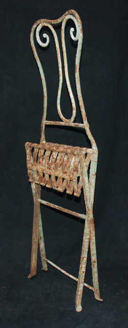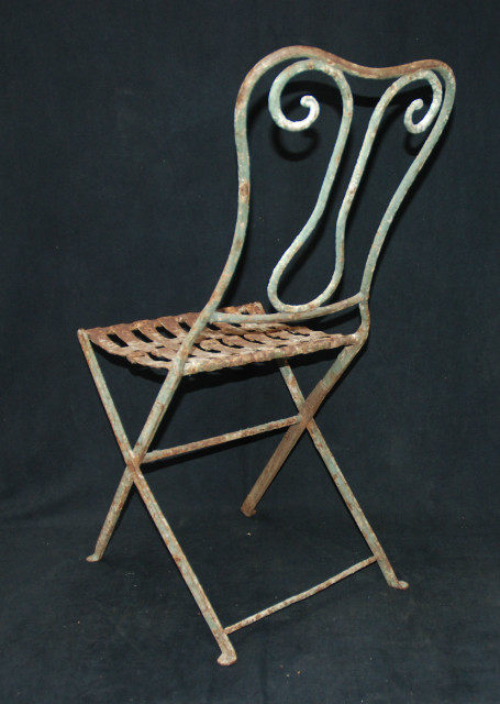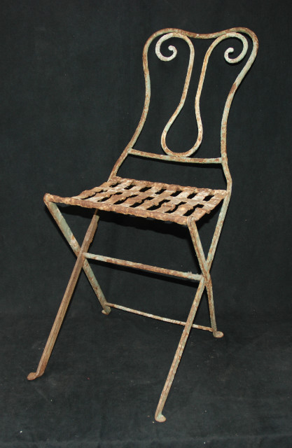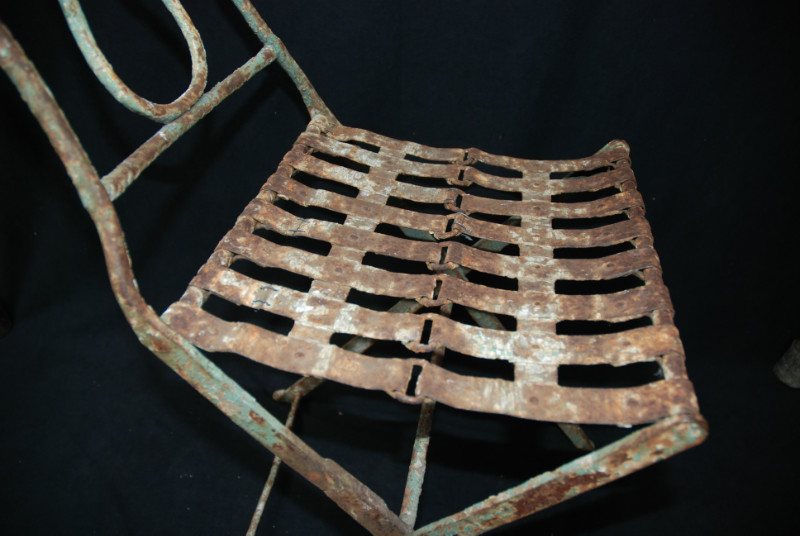 A painted iron folding chair with collapsible seat. Overall height 110 cm. With minor repairs to the seat. Nice weathered patina. Paris, 19th C.