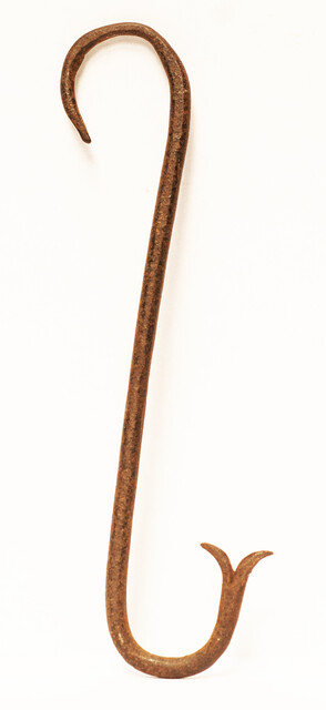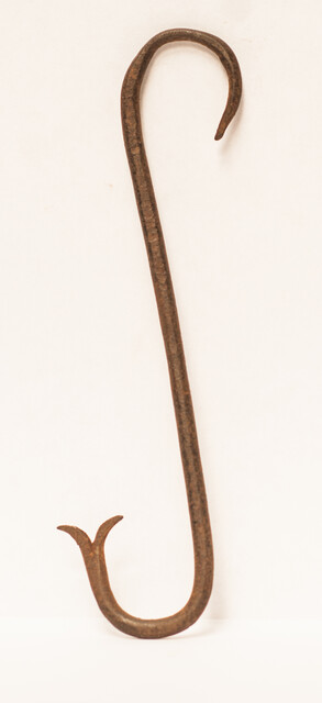An iron suspension hook. Overall length 12,5 cm. The suspension hook is in mint condition.The end with a small fork. The upper end with signs of prolonged use. This sort of hooks were frequently used in the seventeenth century but the decoration as seen here is very rare. Holland, early seventeenth century.