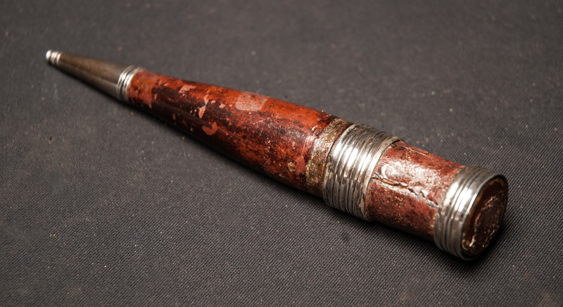 Een laat 18e eeuwse leren messchede met zilveren beslag en een pennemesje met ivoren heft.