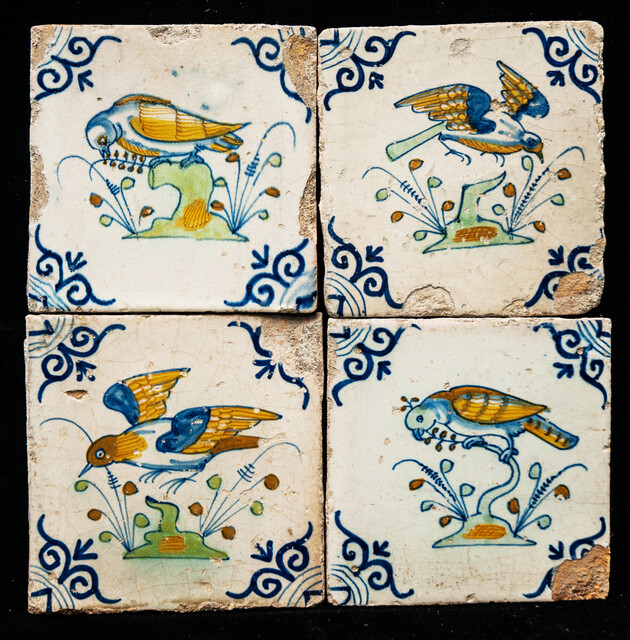 Four tiles with birds. Size 13 x 13 cm. Thickness 12 mm. The tiles show coloured birds. They were made around 1600 and most likely in Gouda.The tiles are in original condition. No restorations or repairs. This type of tile is very rare and quite popular with tile collectors.