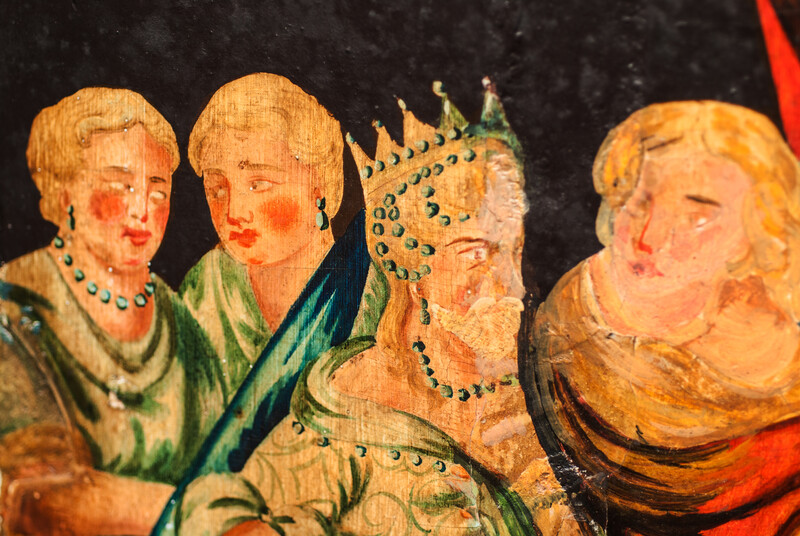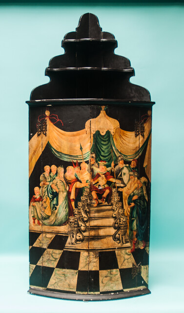 An 18th C. hanging corner cabinet from Ameland painted with a scene of King Solomon on his lion throne.