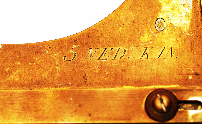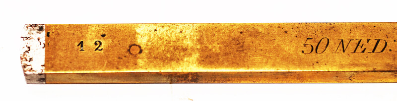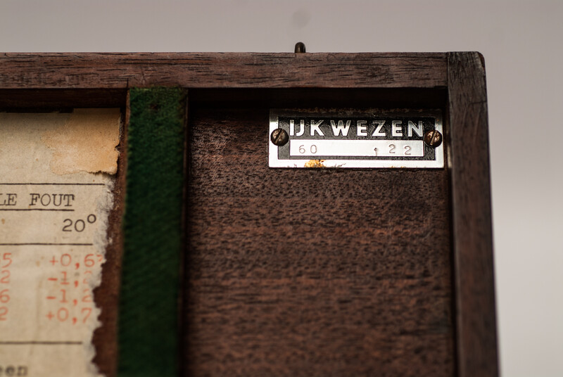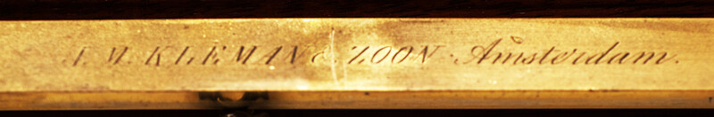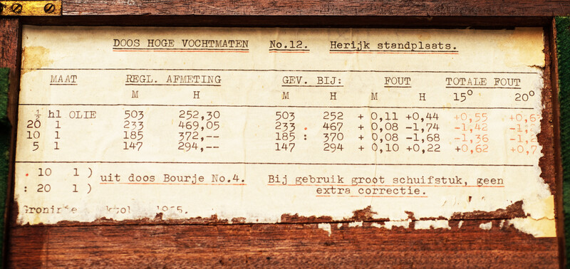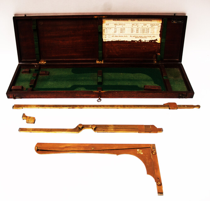 A set of measuring instruments in a mahogany box. Size 58 x 17 x 3,5 cm. Signed J.M.Kleman & Son Amsterdam. All parts numbered " 12 ". The set is complete and in superb condition. Kleman had his shop in Amsterdam between 1758 and 1845 on the Nieuwendijk 126 in Amsterdam. He was famous for his precision instruments. Also abroad. The present set belonged to the official Hallmark Office and their label is also present in the box. It was used for measuring contents.