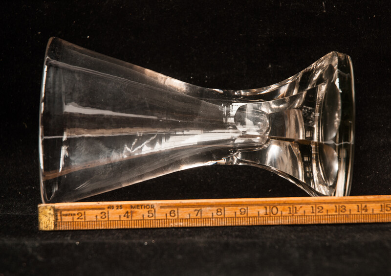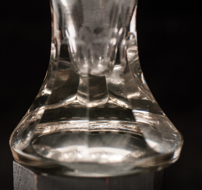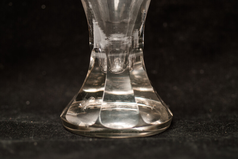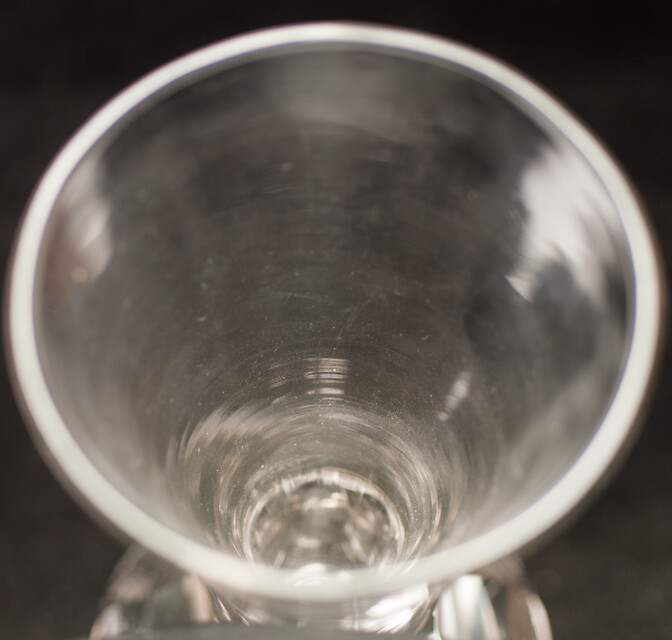 A crystal tot. High 13,5 cm. Upper diameter 8 cm. Diameter foot 7 cm. Weight 350 gram. With eight nicely carved and polished surfaces on the foot. Underneath an also polished pontil. In mint condition. Holland around 1800.