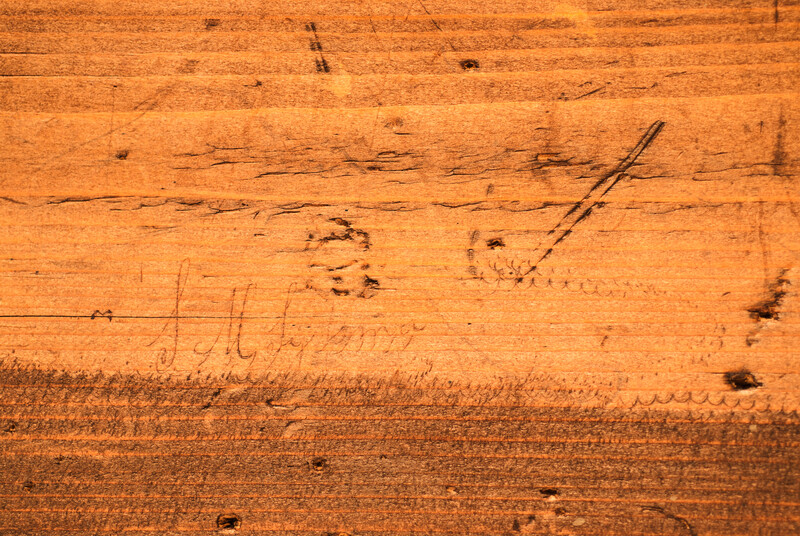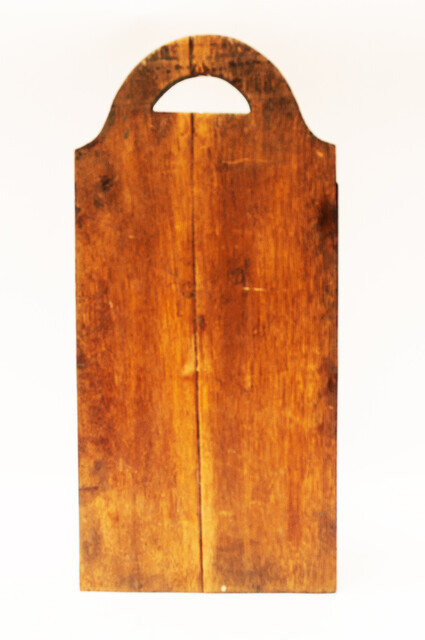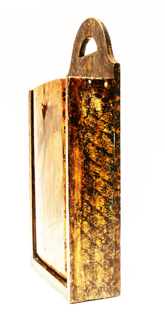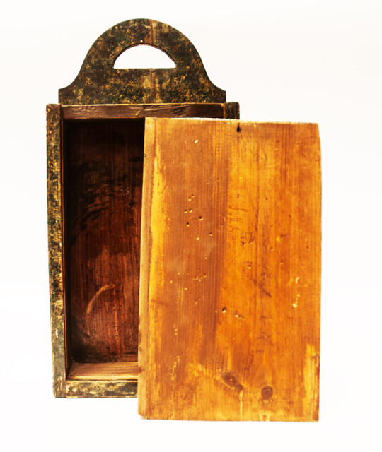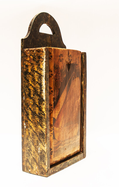 A schoolbox. Measuring 43 x 21 x 8 cm. On the lid a sailing ship. Further the typical stencilled roses around the ship. This type of schoolbox was made in the area of IJlst in Friesland. Made around 1850. The box is in mint condition with an old repair to the lid. On the inside of the lid the name of its owner : "S.M.Sijsma".