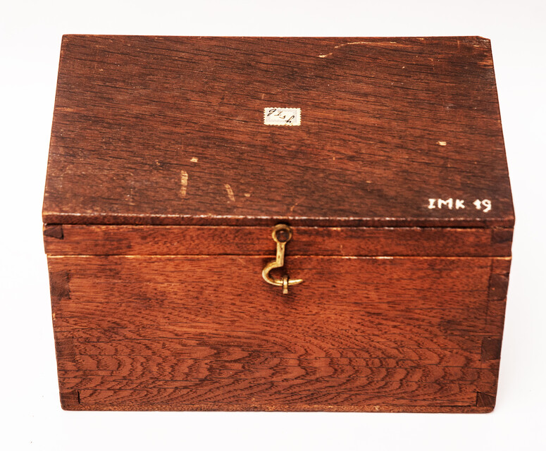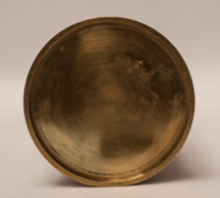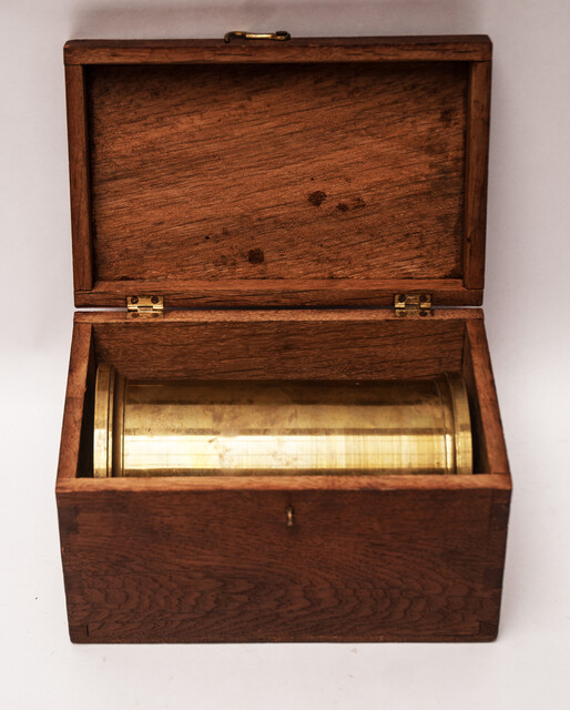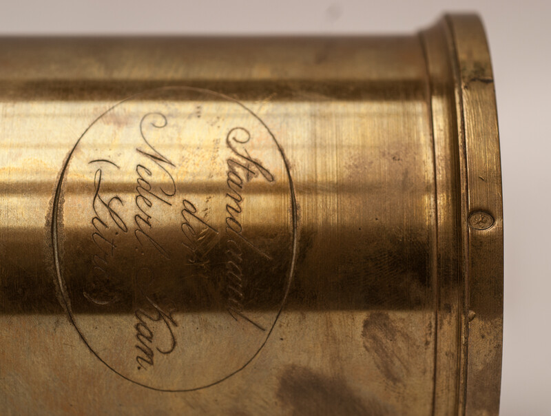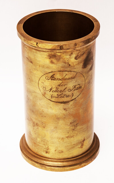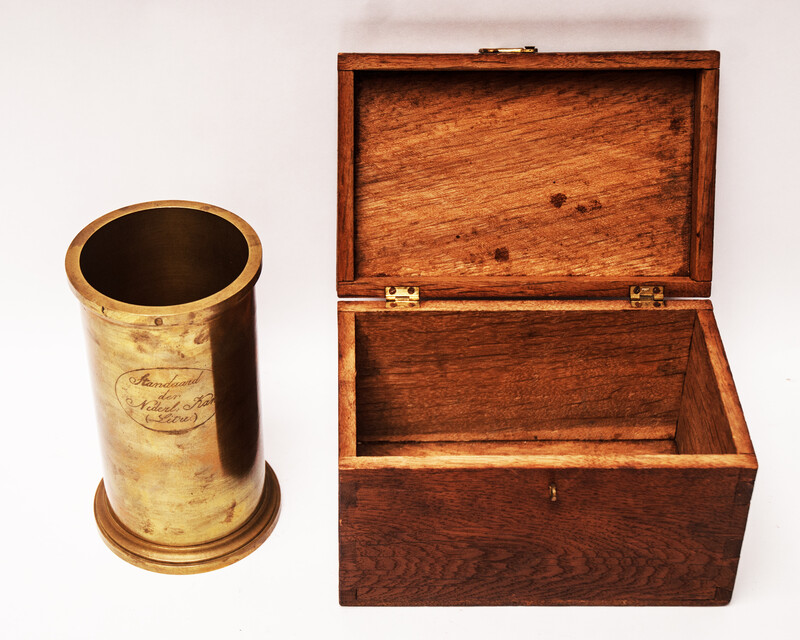 A heavy brass measuring can in a wooden box. Size of the box : 21,5 cm x 13,5 cm x 12,5 cm. Size of the can : 18 cm. Weight 2260 gram. On the can the engraved text: " Standaard der Nederl: Kan .(Litre)" From an official Hallmarking Office. The metric system was adopted from the French in 1820. The can is fitted in a wooden case with some labels and signs from the Hallmarking Office. Can and case in mint condition.