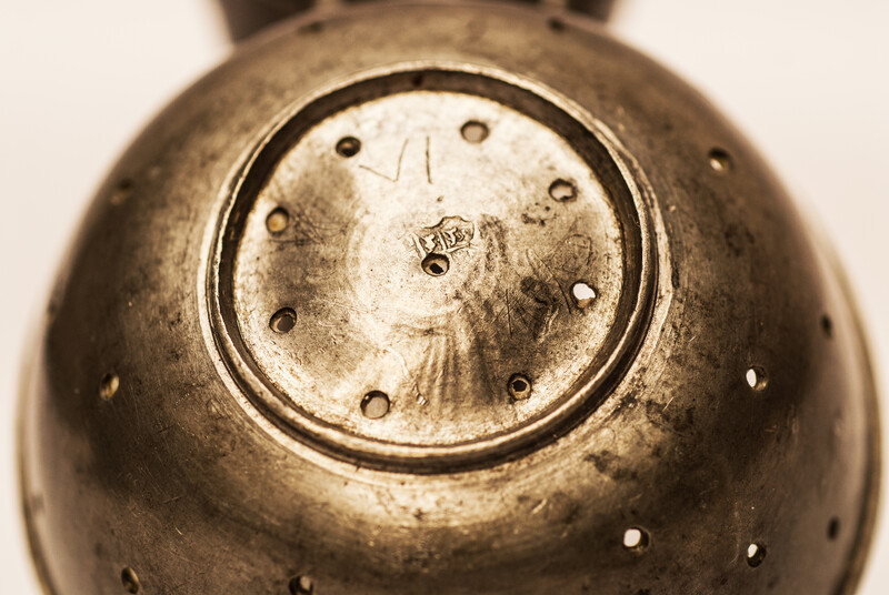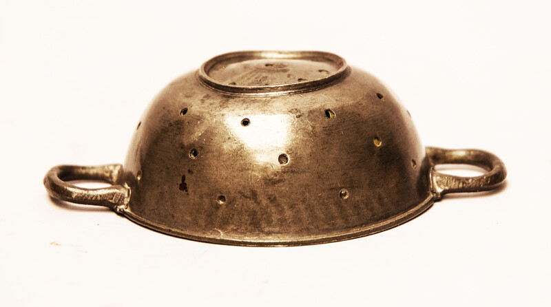 A pewter toy strainer with 18th century Dutch hallmarks.