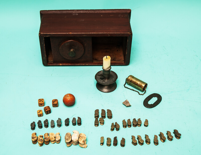 A rare early 19th C. box with a sliding lid, containing a large quantity of "bikkels" on one side and lighting utensils on the other.