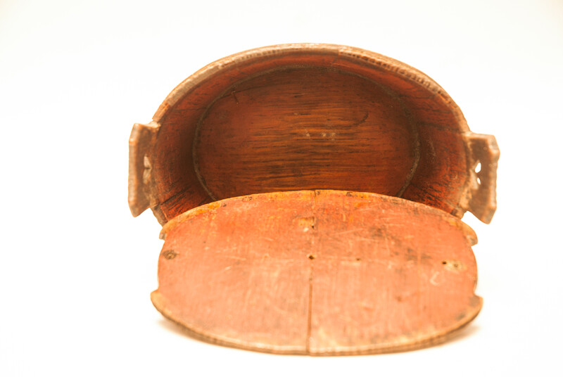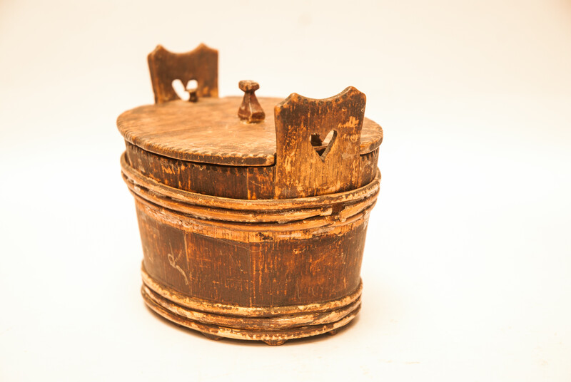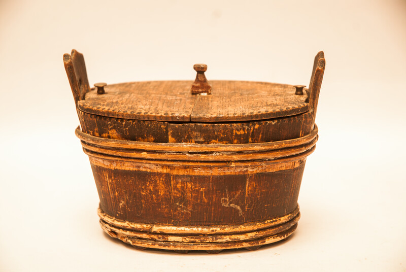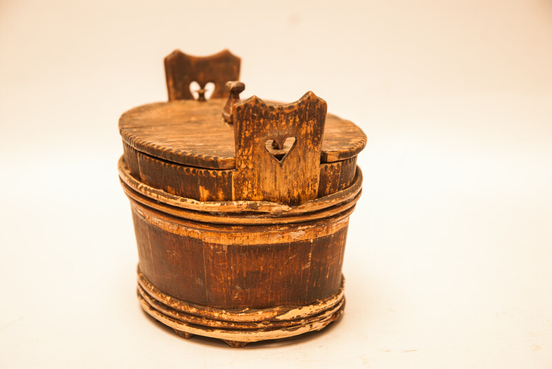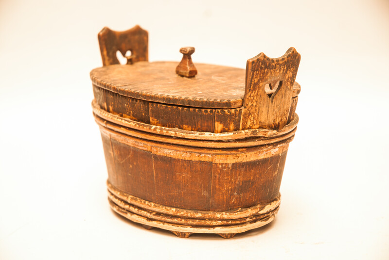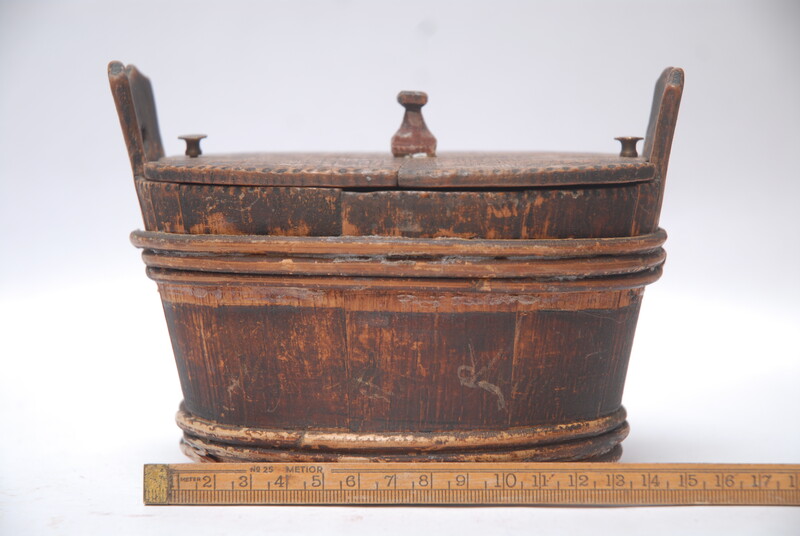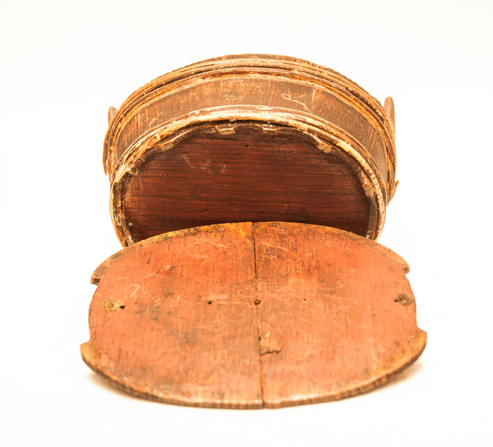 A buttercup. High 12 cm. Wide 12 cm. Made from cooped oak with willow bands. Painted in a red colour. Separate lid with two brass and one wooden peg. Inside also painted in a red colour. Nice patina. On several small feet in a darker kind of wood. In good condition with signs of use. Friesland around 1750.