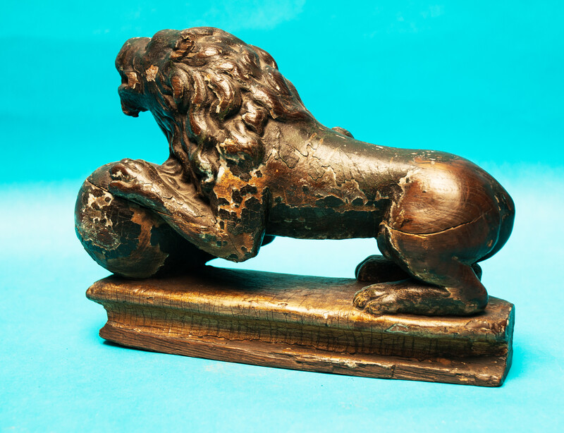 A painted oakwood lion. Height 22 cm. Length 32 cm. Well carved oakwood and painted green. On a yellow base. His left paw resting on a large ball. This type of decoration was displayed on the rudder of traditional Frisian sailing ships. In good condition, considering its age. Friesland, eightteenth century.