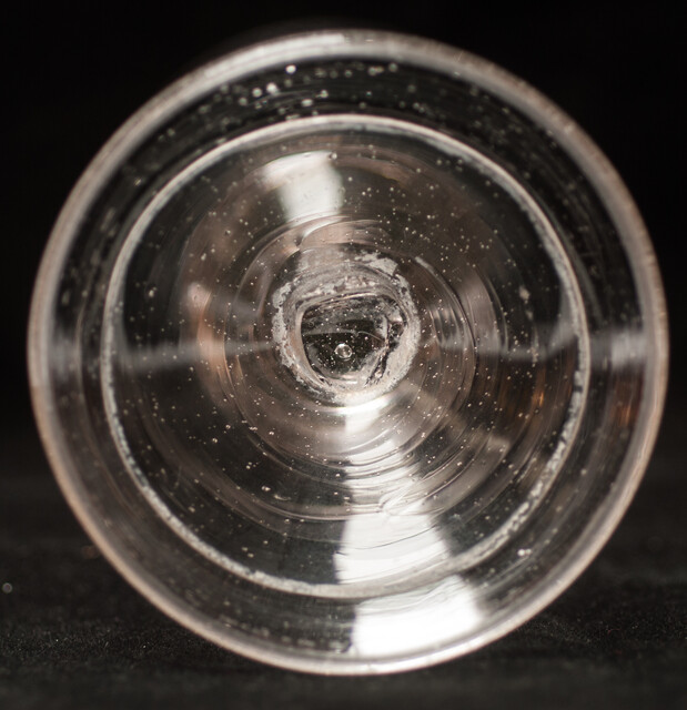 A glass. High 15 cm. Upper diameter 6,5 cm. Diameter foot 7 cm. Weight 140 gram. Sodaglass with several irregularities. Hollow foot with a folded rim and an early unpolished pontil. Mint condition Holland, around 1725.