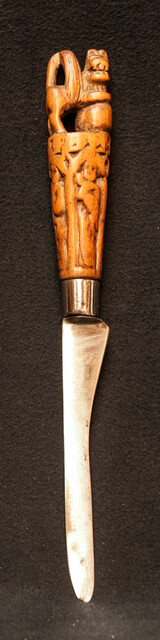 A knife. Overall length 23 cm. Length of handle 10 cm. The boxwood handle crowned by the symbol of the city of Hoorn, and decorated with Hope,Love,Faith and Justice. Very delicately executed on all sides. In good general condition with signs of use. No damages, repairs or restorations. West-Friesland, 18th C.
