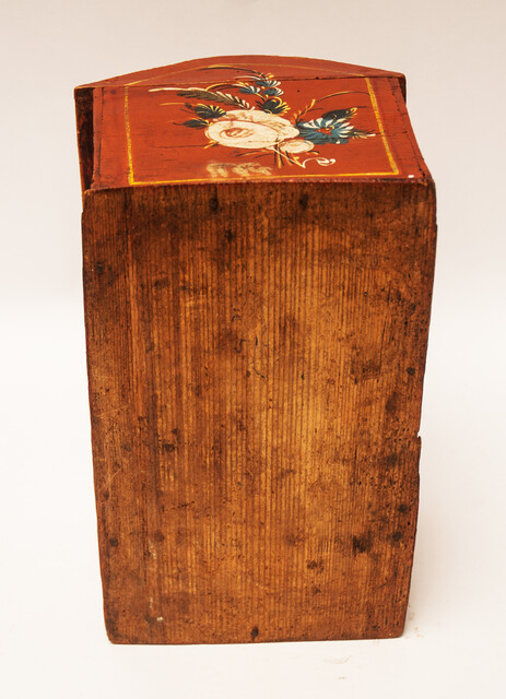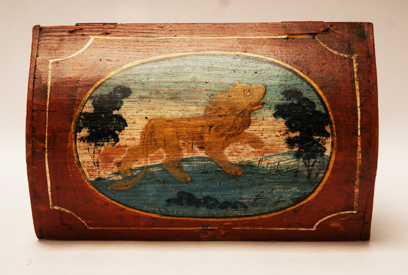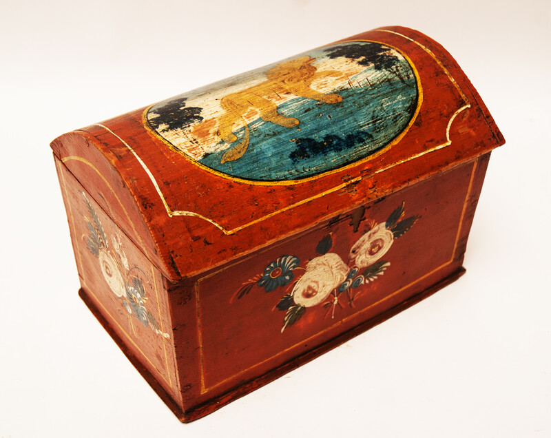 A painted wooden box. Long 25 cm. Wide 16,5 cm. High 16,5 cm. On the convex lid a delicate painting of a lion in a landscape with trees. On all sides a painting of flowers. The inside is also painted in red. The box is in good condition with minor signs of use. This type of decoration is called "Wismuth Malerei" because of the use of the chemical element "Bismuth". Bohemia, 18th century.