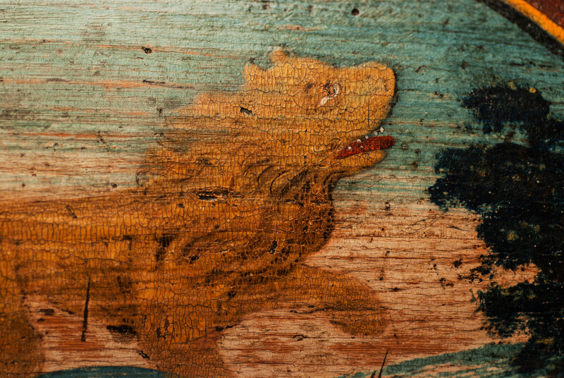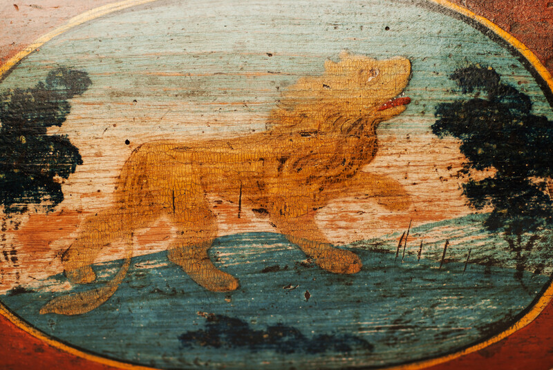 An eightteenth century German painted box with "Wismuth Malerei" featuring a lion in a landscape.