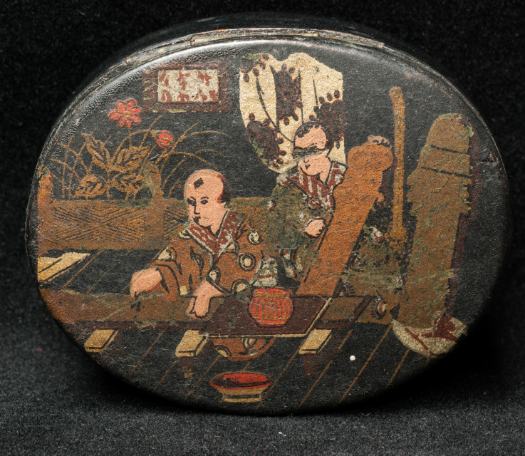 An oval papier machÄ— snuffbox, measuring 6,5 x 5 x 3 cm, painted with a "chinoiserie" scene. 19th C.