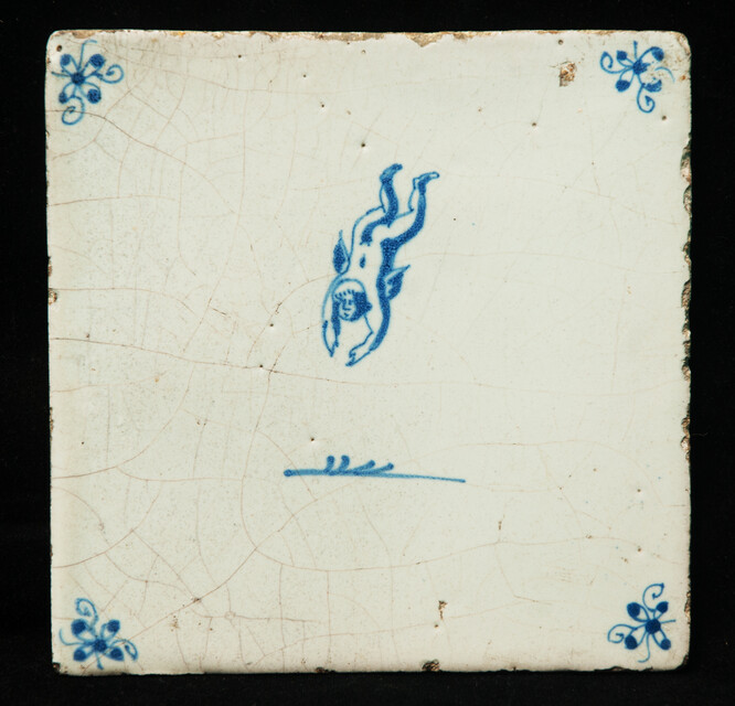 A Delft blue tile. Measuring 13 x 13 cm. Thickness 8 mm. The tile shows a falling angel. It is in mint condition. No damages, repairs or restorations. The tile dates from the beginning of the 18th C. The theme of the fallen angel is quite rare.