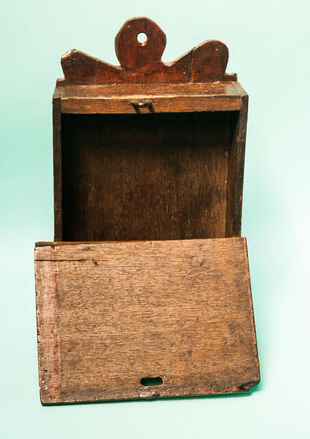 An oak schoolbox. Overall height 37 cm. Width 23 cm. Depth 8,5 cm. The construction is typical for the province of Zeeland with a divided front connected with two original forged iron butterfly hinges. The box is decorated with both kerbschnitt and red and white paint. On the bottom half the owners initials: "J.M.". In very good condition with an old repair to the upper back. Most connections with wooden pegs. Zeeland, mid 18th C.