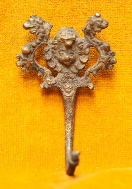 six 17th C bronze wall hooks. From an excavation in Amsterdam.