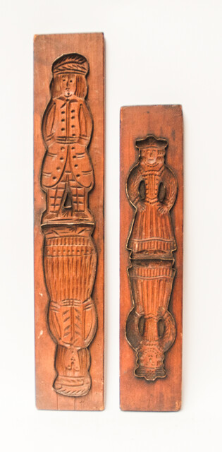 Two cookie moulds. Length 61 and 48 cm. Both moulds with a metal rim around the images. This is typical for a rather uncommon type of mould, called "TAAI-TAAI". Both moulds with two men and two ladies. In perfect condition, ready for use in December.